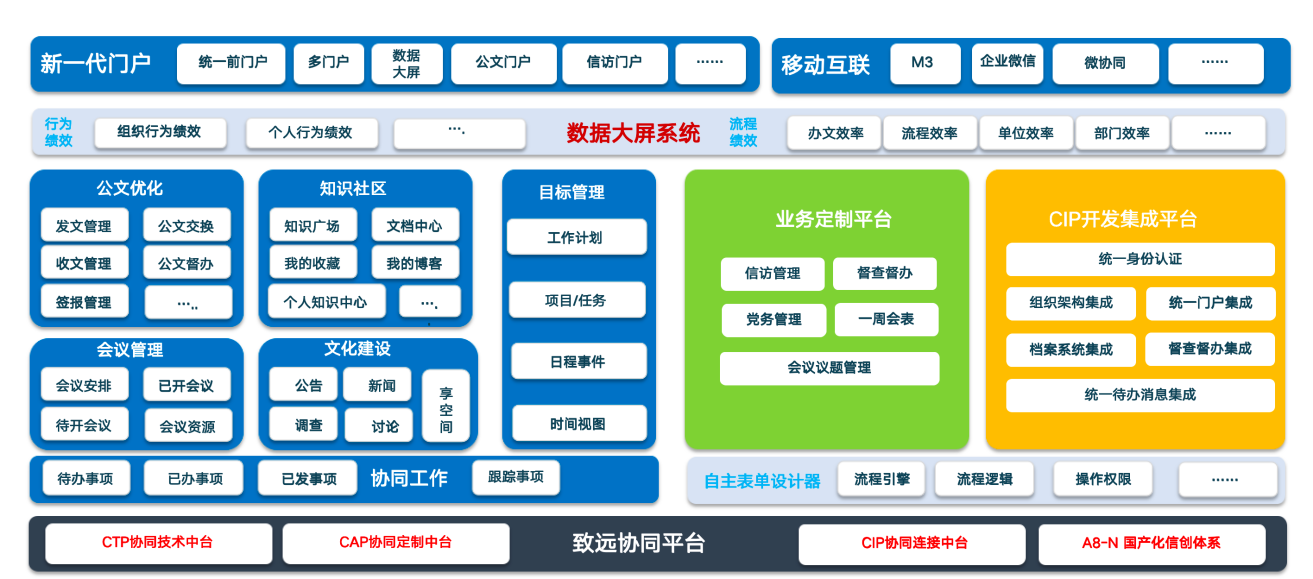 總體建設藍圖繪制瞭(le)高校協同辦(bàn)公平台的建設框架。從基礎應用的角度,主要包括 “基礎辦(bàn)公”、“統一信息門戶”、“流程管理”、“知識(檔案)管理”、“公文管理”“督查督辦(bàn)”“領導日稱(chēng)”“信訪管理”“移動辦(bàn)公”、“會議管理”、“文化管理(信息發布)”和“協作溝通等版塊。