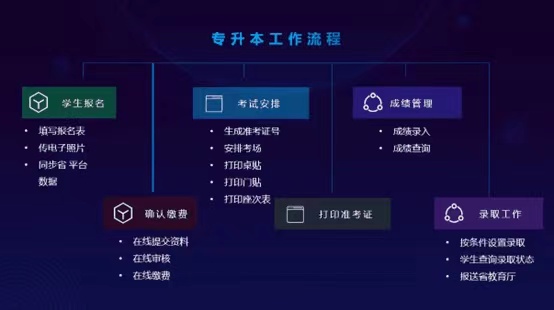 考試報名系統主要是圍繞著(zhe)專升本報考工作的源頭展開,覆蓋瞭(le)報名工作整個業務流程。