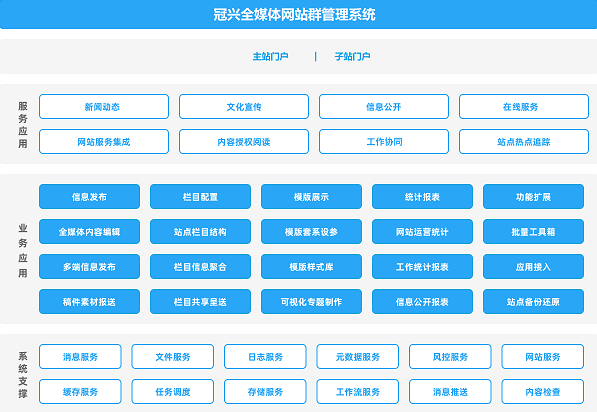 冠興全媒體網站群管理平台具備(bèi)安全性、穩定性、易用性、擴展性等系統特點,通過其快速整合發布新媒體内容的能力和智能化管理網站的能力,實現立體多元化的信息傳(chuán)播矩陣,是當前用戶網站群升級的完美解決方案。